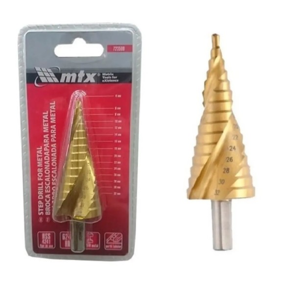 A Broca Escalonada de 9-36mm HSS Espiral Profissional MTX é uma ferramenta projetada para fazer furos precisos em uma variedade de materiais, incluindo aço, aço inoxidável, metais não ferrosos e plástico. Seu design em espiral permite uma perfuração mais fácil e eficiente em superfícies de metal.