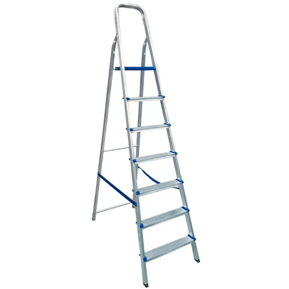 Escada em alumínio para uso doméstico. Leve e prática, é essencial para o dia-a-dia. Seu patamar de polipropileno de alta resistência dá segurança para o trabalho diário